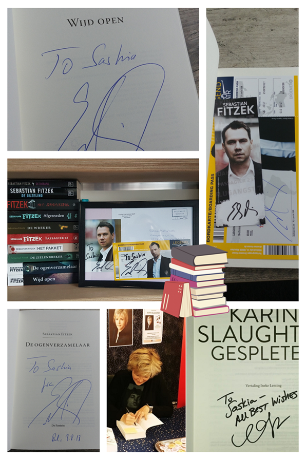 I – Important moment in your reading life: Van Camilla Läckberg en Jo Nesbo heb ik handtekeningen op een toffe fotokaart. Maar met de 2 favoriete boeken van Fitzek ging ik wat verder. Ik stuurde ze op naar Duitsland (mega spannend of ik ze nog terug kreeg haha) en gesigneerd en wel kreeg ik ze terug. Met nog een extra boekenlegger en ’ticket’ van zijn nieuwe boek toen, Stoel 7A. Ik ben er echt MEGA trots op. Ook ging ik een hele tijd terug naar een meet & greet in de Bruna, waar ik Karin Slaughter zag en ze haar toen nieuwste en mijn favoriete boek Triptiek signeerde. Tof om dit zo te hebben als thriller-fan!